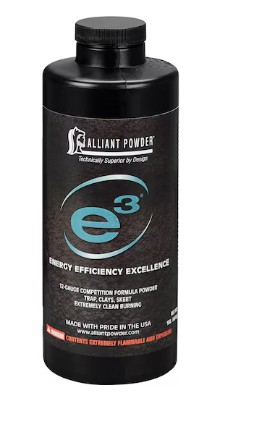Alliant e3 represents the next generation of reloading powder technology and offers the clay target shooter what he/she needs to maintain the winning edge. This 12 ga powder possesses a perfect balance of the qualities desired by competitive shooters. e3 features reduced charge weights, is the cleanest burning 12 ga. shotshell powder available, and has environmental stability and ultra-premium quality to provide more consistent and reproducible performance all-year round. It is destined to become the shot shell powder by which all others are judged. Named after its core qualities of energy, efficiency and excellence, this exciting powder offers 12-gauge target shooters a high-performance product that stands apart from the rest