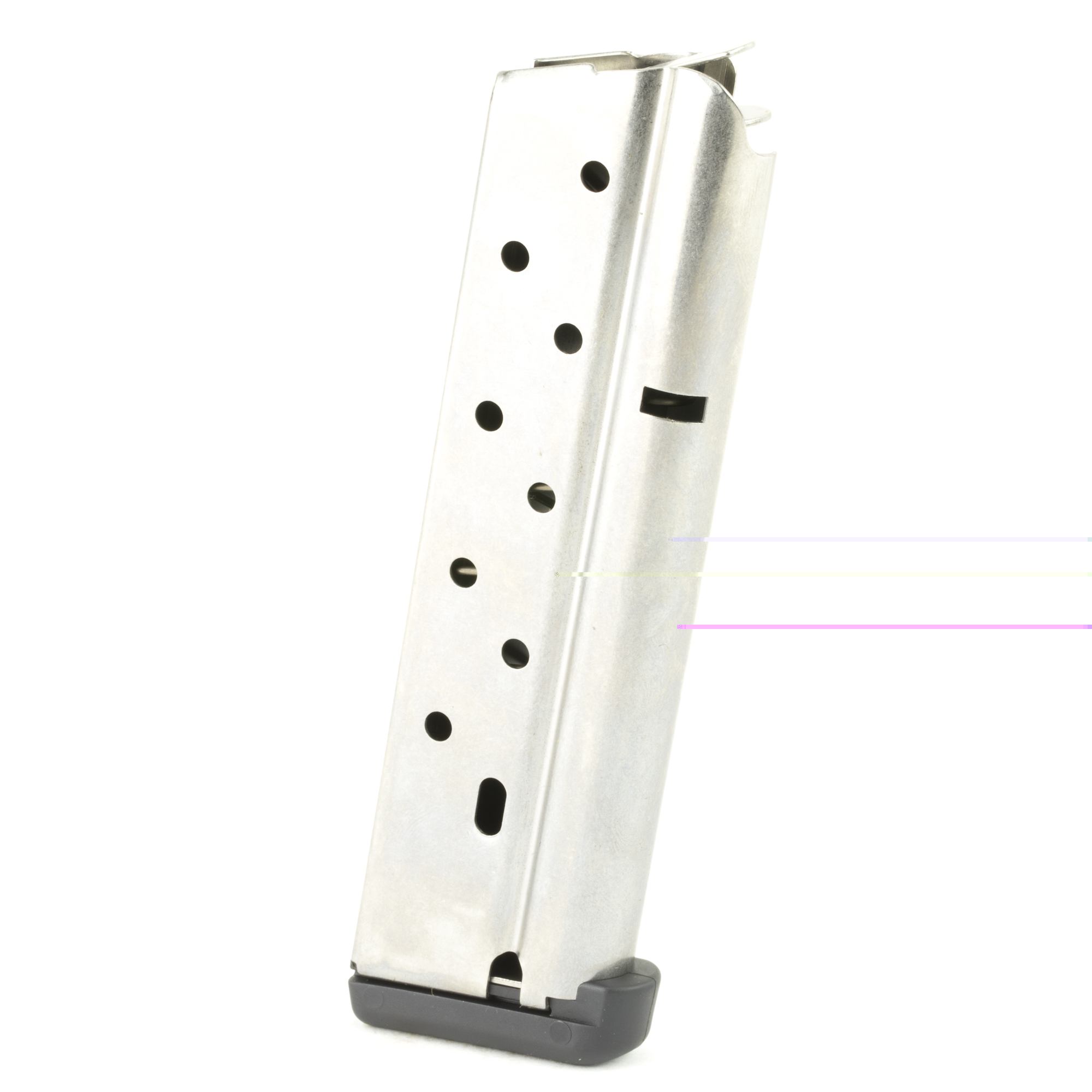 Power Mags are lean and sleek, yet they are extra-heavy-duty with increased reliability and service life. A unique all-steel follower design yields the lowest possible bearing surface for long-lasting function in dirty environments when ongoing cleaning and maintenance may not be possible. The unique follower design also functions as a spring, which allows the high tensile rocket wire spring coils to be the largest (side to side, front to back, and top to bottom) of any extra capacity .38 Super 1911 magazine.