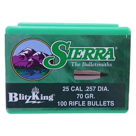 The 25 caliber 70 (flat base) & 90 (boat tail) grain BlitzKing bullets were created to fill the demand for the longer range varmint crowd taking over where Sierra’s current .20-6mm BlitzKings leave off.